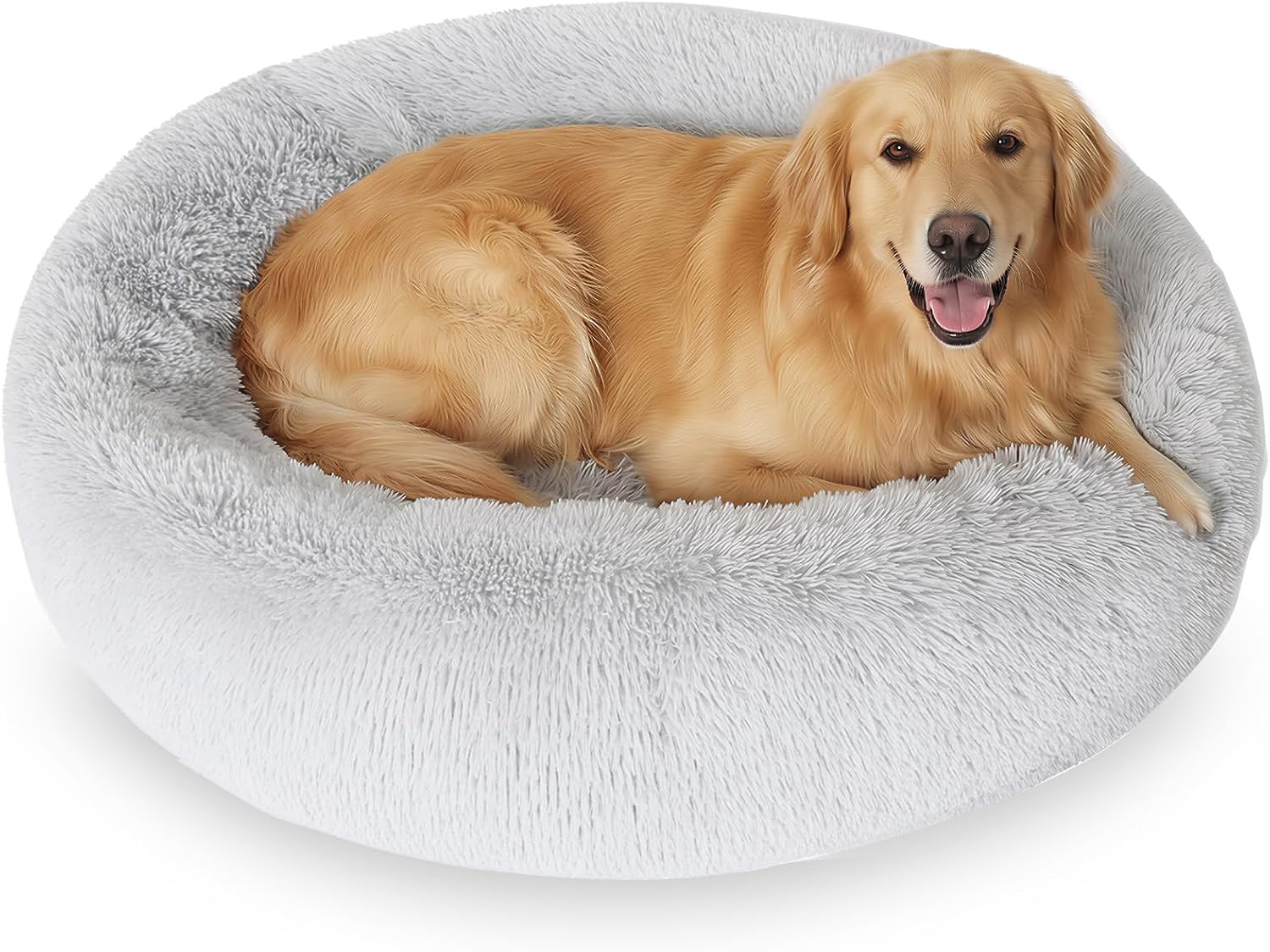 • A plush, faux-fur anti-anxiety bed in a donut shape for smaller dogs, offering cozy, calming support